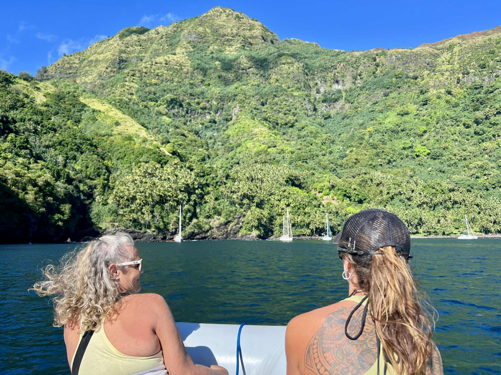 A familiar hull brought joy to our harbor: Eric on S/V Abayome, a friend from Curaçao where we shared scuba dives and outings. We rented a jeep to explore Hiva Oa, laughing and swapping stories that enriched my writer’s notebook. Meanwhile, our friends John and Shannon on S/V Charisma, who started the crossing with us, are ahead, sending photos of vibrant islands, cultural festivals, and clear waters teeming with mantas, dolphins, turtles, and sharks. The murky waters of the Marquesas have kept us from diving, but their images fuel my imagination for future scenes.
